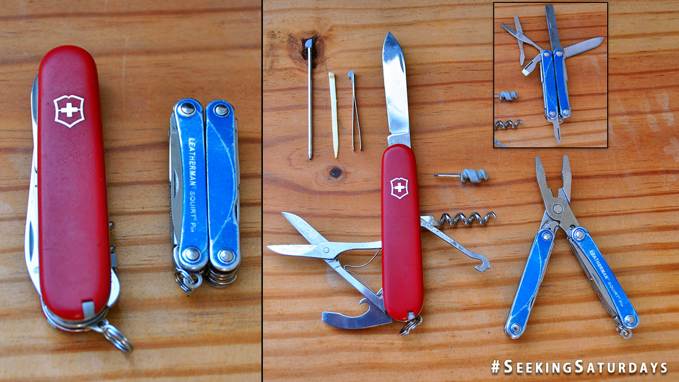 - Small multi-tool – like the Swiss Army Compact (has a built-in pen!) or a Leatherman Squirt PS4 (I carry both)